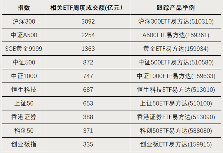 从成交额看,上周跟踪沪深300、中证A500、SGE黄金9999、中证500、中证1000等指数的ETF成交持续活跃,周度成交额居前。其中,A500ETF易方达(159361)等跟踪中证A500指数的ETF合计成交额超过2200亿元。