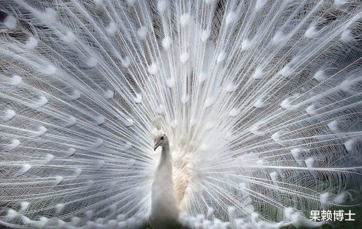 还有那只仿佛穿着蕾丝婚纱的白化孔雀。当它开屏时,没有了花里胡哨的眼状斑点,取而代之的是一种极致的纯净。