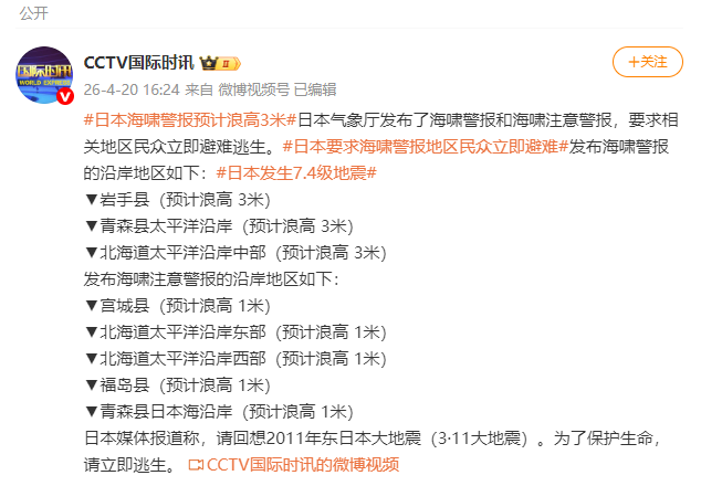 据CCTV外洋时讯音问,日本征象厅发布了海啸警报和海啸防卫警报,条目关联地区巨匠立即隐迹逃生。