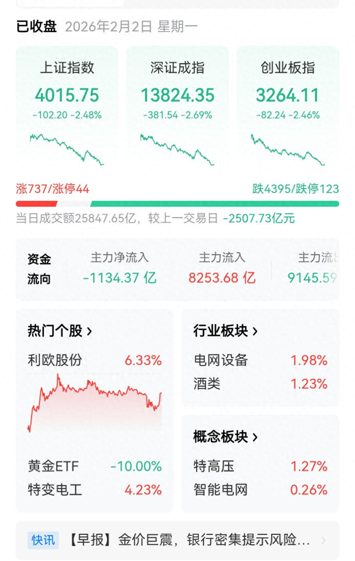 2026年2月2日,A股市场遭遇大幅调整,三大指数集体下挫。上证指数跌2.48%,报收4015.75点;深证成指跌2.69%,报收13824.35点;创业板指跌2.46%,报收3264.11点。两市成交额2.58万亿元,较上一交易日缩量逾2500亿元,市场呈现普跌格局,超4600只个股下跌,仅771只个股上涨。