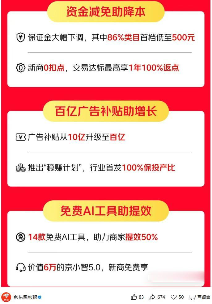 在裁汰运转门槛上,京东针对新商家“运转难”的问题,策画大幅下调企业铺保证金,遮掩3000多个类目,其中近九成类目首档保证金低至500元,涵盖前卫、3C、家电家居等多个品类。同期,京东将14款“京麦”AI器具沿途免费怒放,遮掩选品、客服、数字东说念主直播等筹划全链路,蓝本价值数万元的器具免费使用,展望能为商家提高50%的合座筹划着力。此外,0元试运营、全额保障保证金等策略同步长远,商家最快1分钟通畅店铺,单个新商最高可量入计出20万元运转资金,确实完结零职守起步。