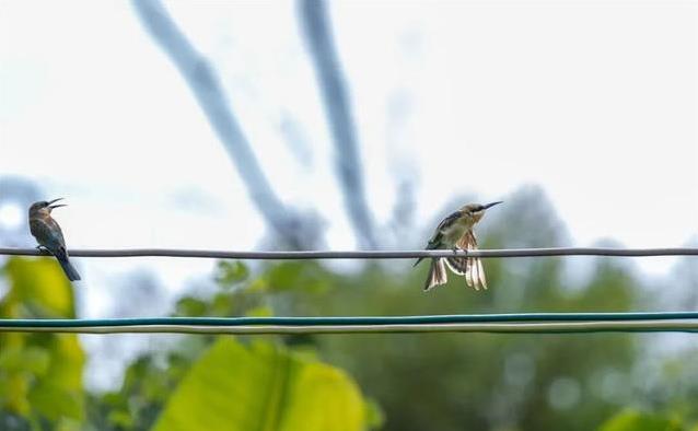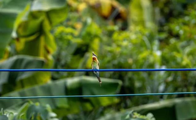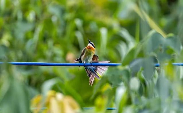4月的元江河谷,热浪一阵阵涌来。铁路沿线或者之间,一群色调好意思艳的小鸟在空中轻快遨游。它们喉部带着栗红色,翅膀醒目蓝绿光泽,就怕停在半空快速扇动翅膀,就怕俯身捕捉虫豸,在阳光照耀下显得荒谬珍爱。这些小鸟即是栗喉蜂虎,常被东谈主称作中国最好意思的小鸟之一。