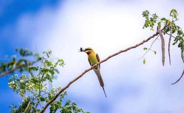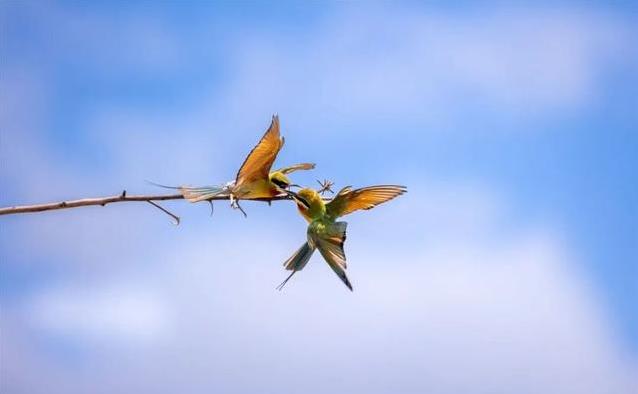 蜂虎鸟的羽毛心思丰富,容易鉴识,主要以蜜蜂、胡蜂和蜻蜓等虫豸为食。栗喉蜂虎、蓝喉蜂虎和绿喉蜂虎都列入国度重心保护野生动物名录,属于生态系统里的窒碍物种。它们的出现,时时响应出当地环境的改善情况。