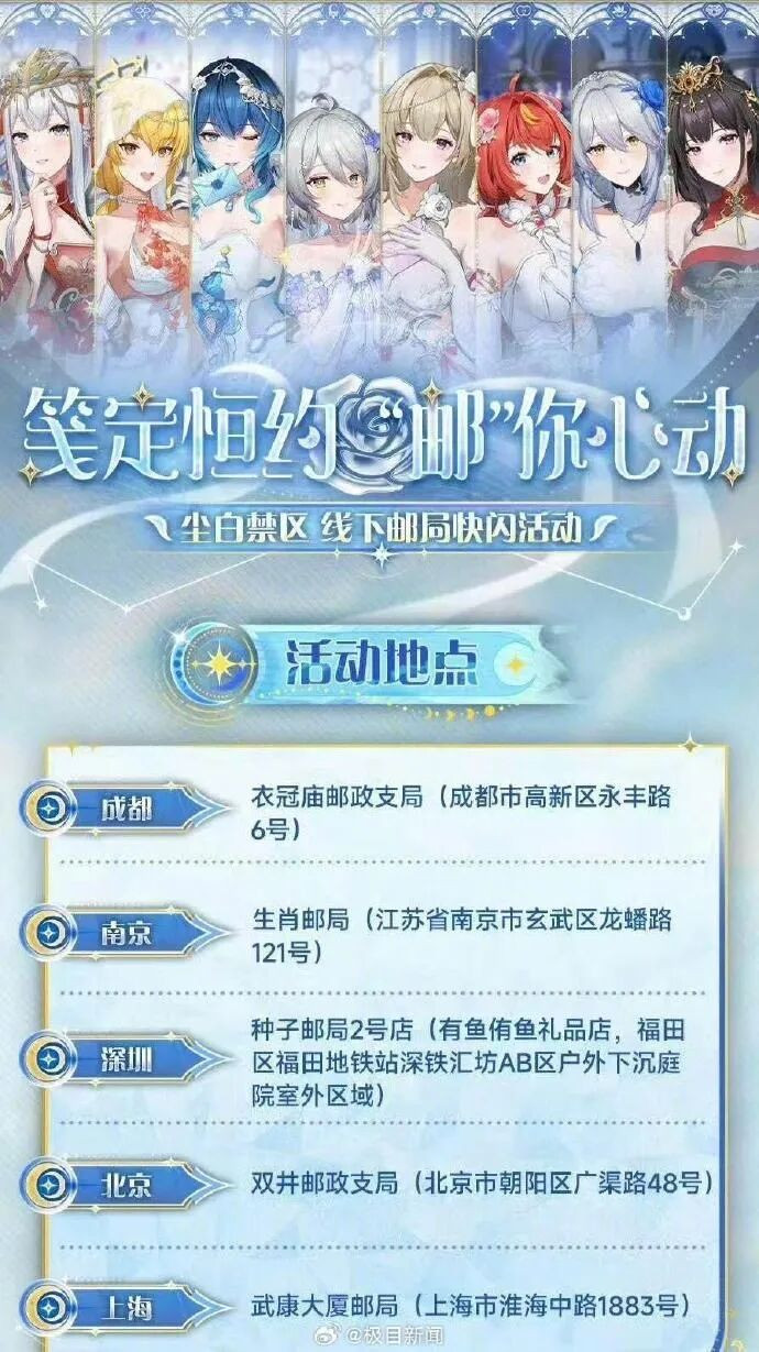2月24日,游戏“尘白禁区”微博发布音书称,“尘白禁区”游戏联动中国邮政推出线下邮局快闪行径,“笺定恒约”邮政联名缅念念礼盒也将同步限量发售。