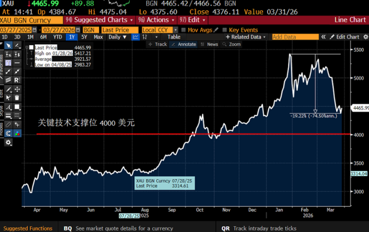 黄金的流动性计帐:黄金从1月底的5,417好意思元高点暴跌近20%,近期在4,300–4,500好意思元轰动。在热战布景下黄金不涨反跌,现实是金融条款收紧的缩影:油价冲击推高了现实利率与好意思元,握有无收益黄金的契机资本激增,触发杠杆清盘。黄金的遥远牛市逻辑未改(华尔街大行年底目的价5,200-6,300好意思元),若涉及4,000好意思元关节扶助,将组成战术性买入契机。