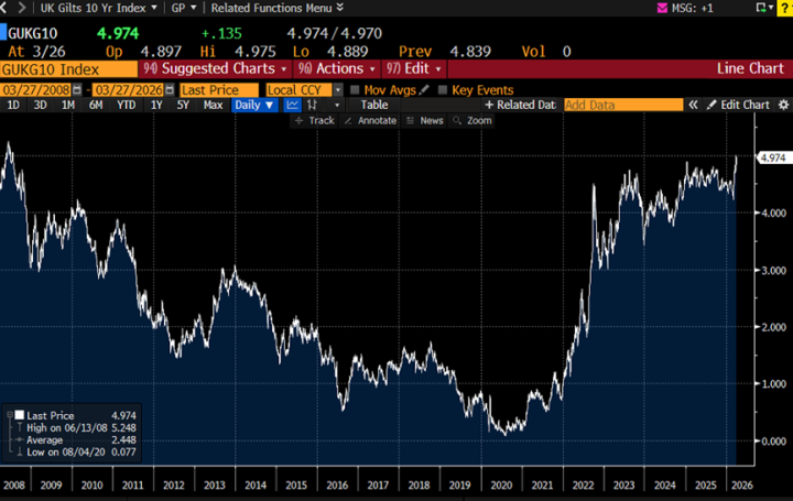 欧洲(最径直的受害者):欧洲央行3月保管利率不变,下调2026年GDP预期至0.9%,上调Q2通胀预期至3.1%。欧洲自然气价钱较战前飙升逾90%,径直挤压企业利润与购买力。英债10年期收益率面对4.97%(2008年来高位),与好意思债长端共振,印证公共金融条款的同步收紧。