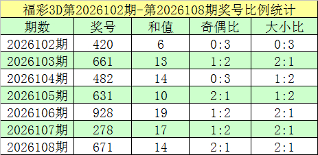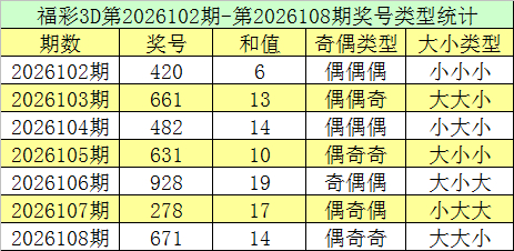 福彩3D第2026108期转头:奖号为671,奖号奇偶比为2:1,大小比为2:1,和值为14,类型为组六。