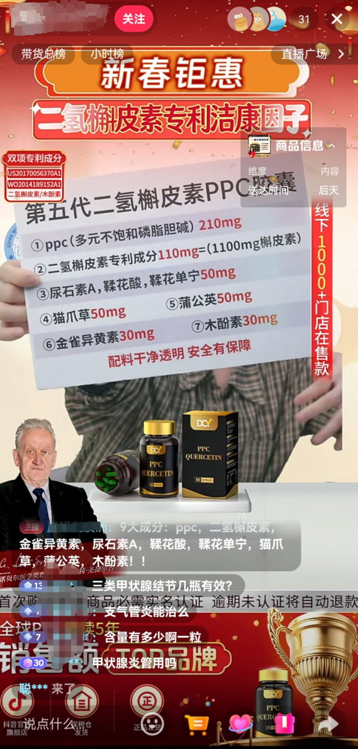 一款香港大药房分娩的槲皮素清肺产物,宣称包含七八种草本要素,但齐未标注各项含量。记者一再追问,主播指着包装盒上“产物净含量16克”,称这即是槲皮素含量。