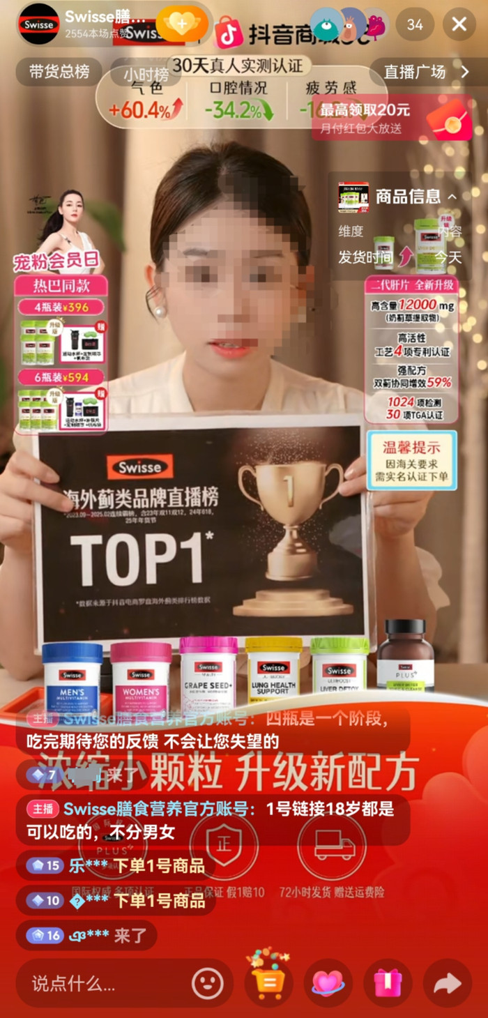 Swisse斯维诗品牌护肝片是网红产物之一,多个直播间打着“热巴同款”“秦岚同款”口头宣传,宣称在多个平台销量逾越。