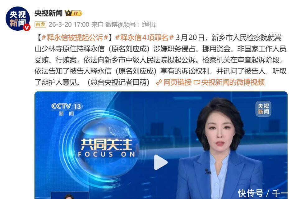 3月20日,新乡市东说念主民巡视院就嵩山少林寺原方丈释永信向新乡市中级东说念主民法院拿起公诉。