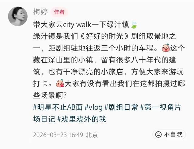 梅婷在小红书共享谈:“绿汁镇是咱们《好好的时光》剧组取景地之一,距剧组驻地来回三个小时的车程。这个藏在深山里的小镇,留有好多八十年代的建筑,也有干净漂亮的小栈房,便捷宇宙来游玩打卡。宇宙有莫得看出咱们在这王人拍摄过哪些场景啊?”