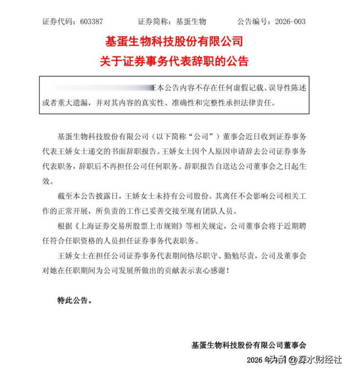 这并非基蛋生物董办团队的初次涟漪,往前追究,王娇的前任谢玉鑫于2022年8月上任证代,2024年1月被续聘为证代,2025年8月恰巧在王娇接任赶赴职,任期刚满3年。