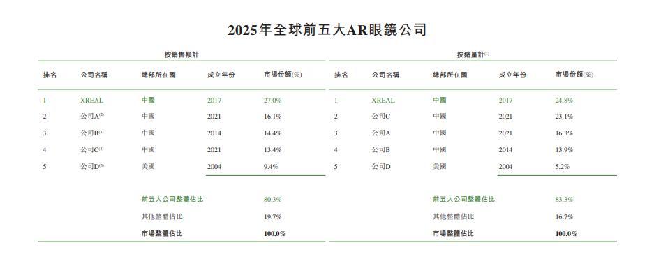 2025年巨匠前五大AR眼镜公司名次,图源XREAL招股书