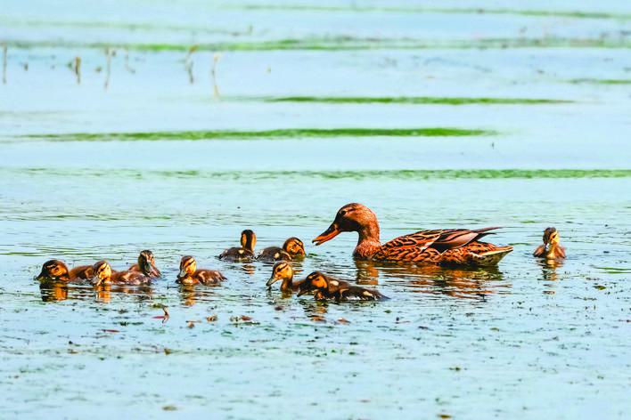 野鸭姆妈带着一群孵化不久的小野鸭在水草间畅快进食。