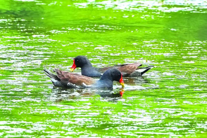 两只黑水鸡知足地在水面上觅食。