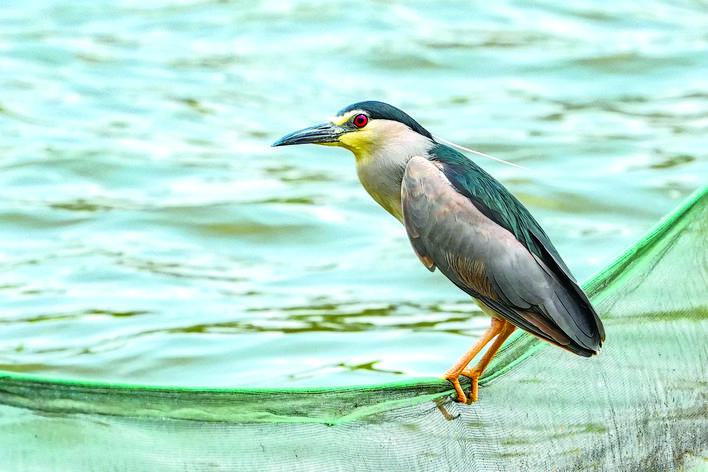 一只夜鹭在湖面的分隔网上静静伫立。