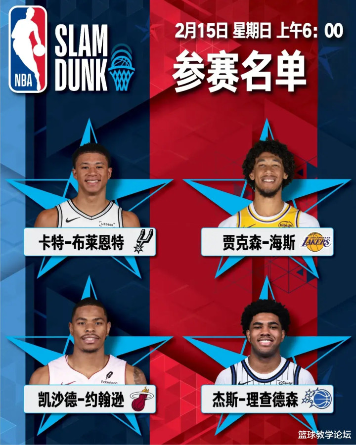 北京时期2月15日上昼8点,全明星扣篮大赛珍摄开动。跟往年比较,本年扣篮大赛不错说星光黢黑:贾克森-海斯(湖东说念主)、卡特-布莱恩特(马刺)、凯沙德-约翰逊(热火)和魔术的杰斯-理查德森(两届篮王杰森-理查德森之子)。