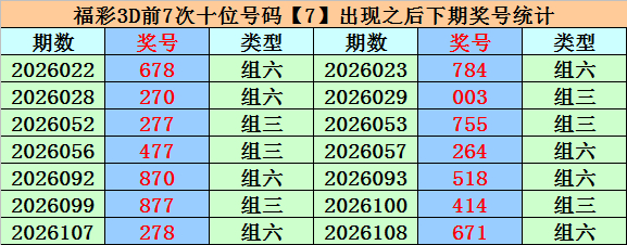 十位分析:十位上期奖号为7,历史上十位号码7已出现837次,最近100期该号码开出7次,上期为重迭号码。