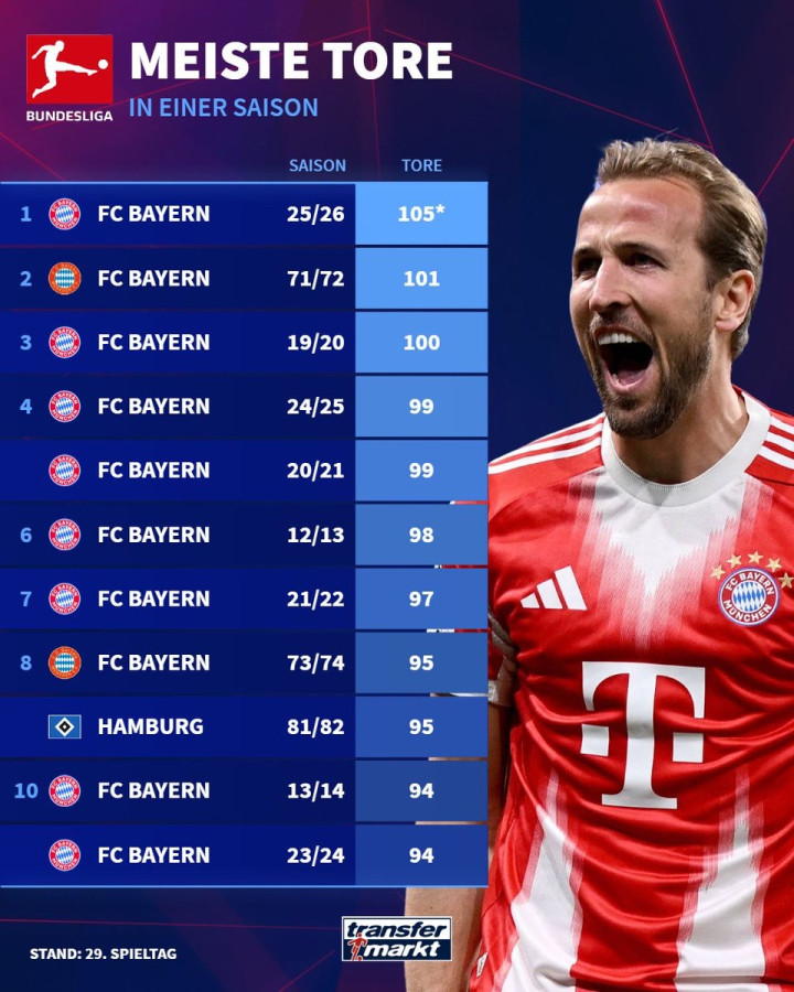 1.拜仁(2025/26赛季):105球(第29轮后)